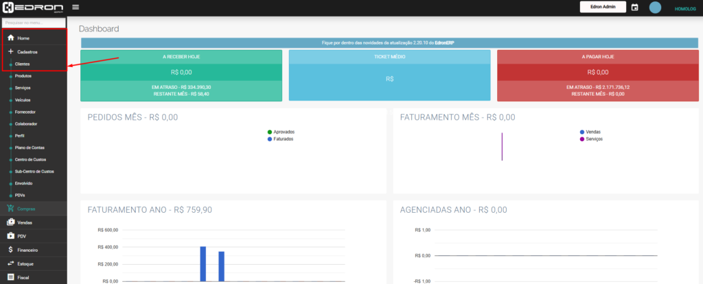 Na tela inicial (Home), clique no menu lateral em Cadastros > Clientes.