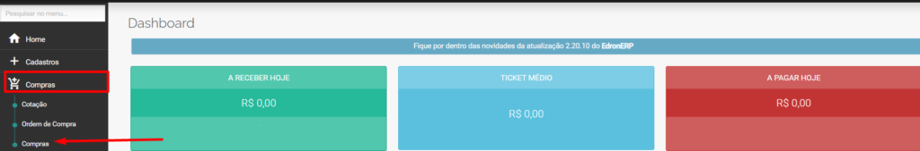 No menu lateral, clique em Compras → Compras para abrir a tela principal.