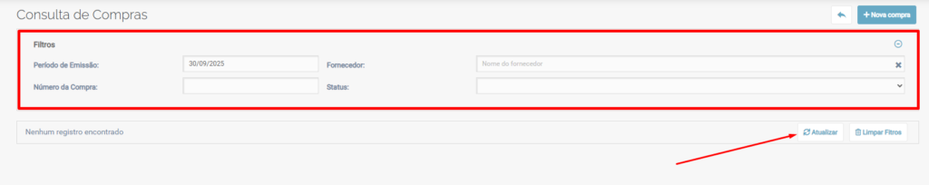 Use os filtros (período, número da compra, fornecedor e status) para localizar as compras já cadastradas.