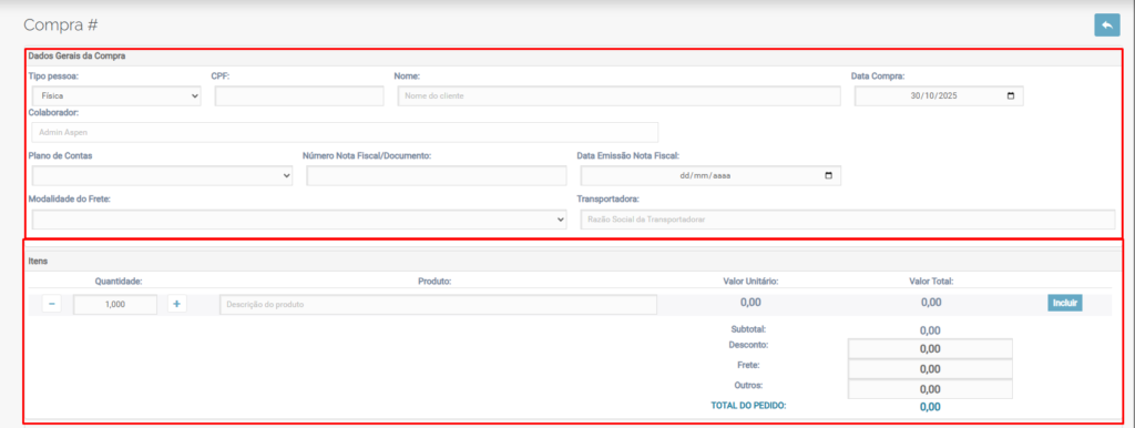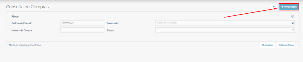 Clique em + Nova Compra no canto superior direito para iniciar o cadastro.