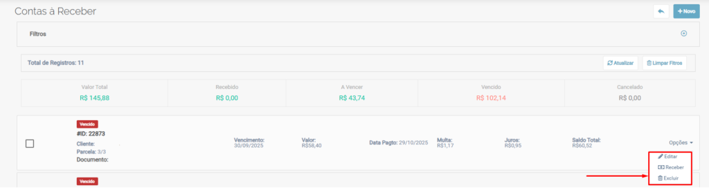 Você poderá editar, excluir ou baixar o pagamento diretamente nas opções.