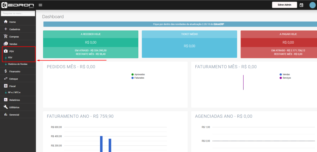 Na Home do Edron ERP, entre em Vendas → PDV pela coluna lateral.