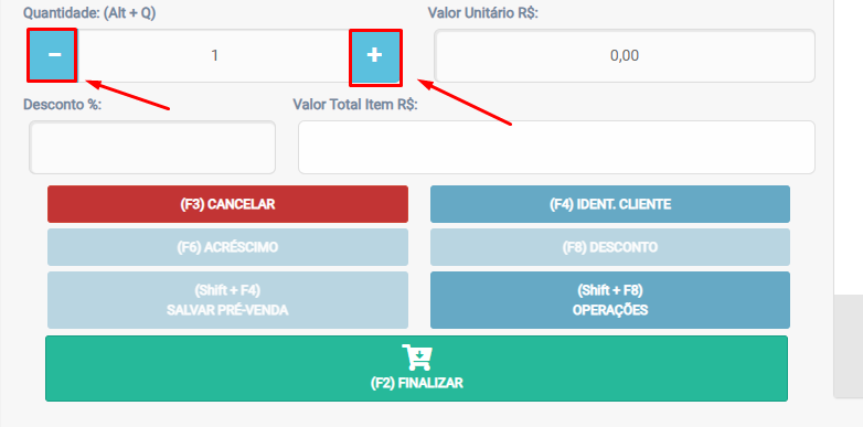 Use os botões – / + para alterar a quantidade e confira o Valor Unitário R$.
