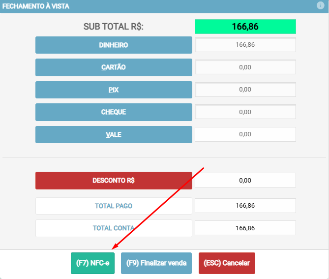 Com a forma de pagamento definida, clique no botão (F7) NFC-e para gerar a nota fiscal.
